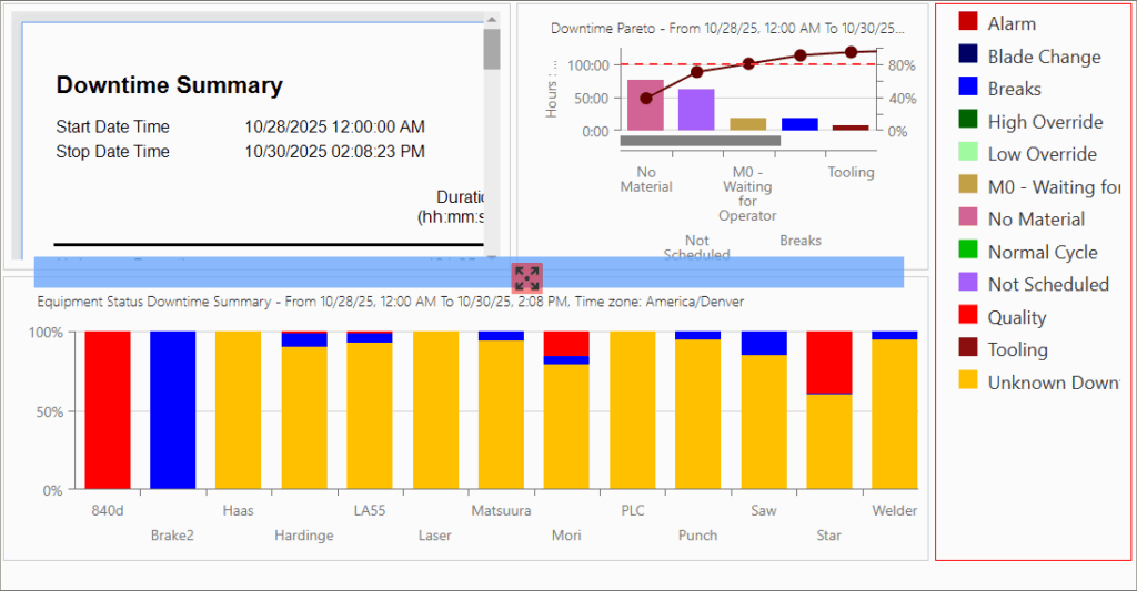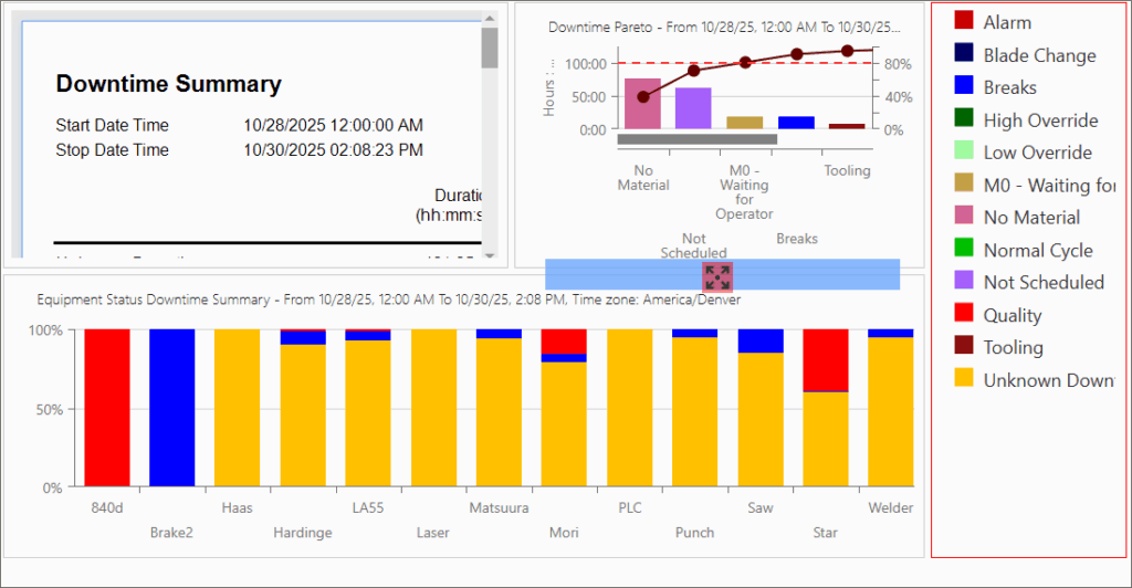 - Equipment: Select the Equipment for which data will be displayed. Different options are available for Display Grouping depending on the selected View. Some views for example support Display Grouping by Equipment Groups, which will aggregate data on the chart based on groups rather than individual machines. Once Equipment has been selected, click Submit to save changes and preview the View.